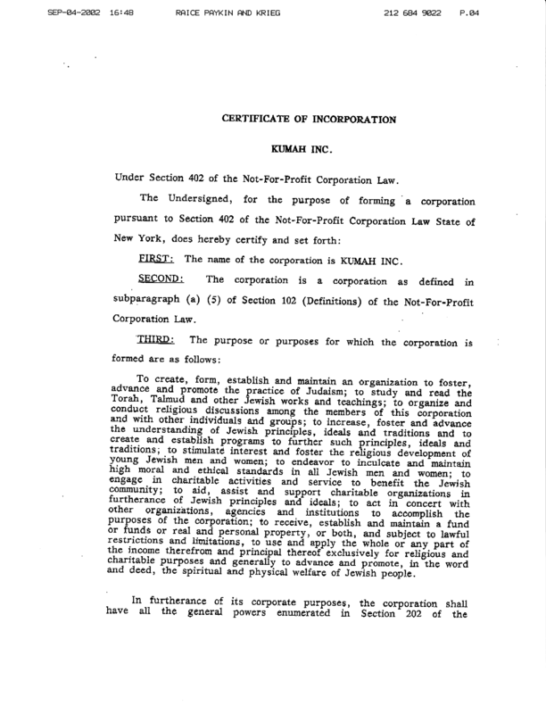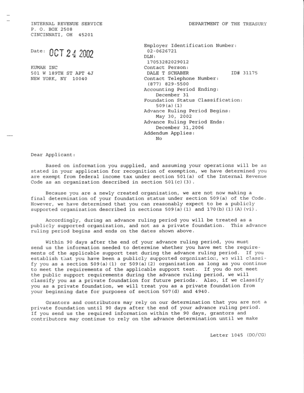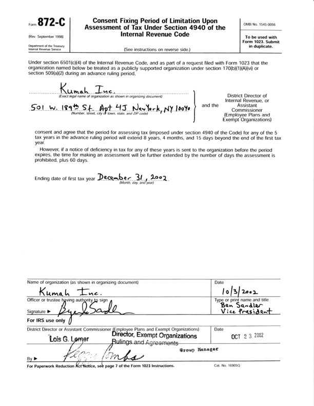 Kumah incorporated as a non-profit organization on May 30, 2002 in New York State, and received Federal 501(c)(3) tax-exempt status on October 24, 2002.